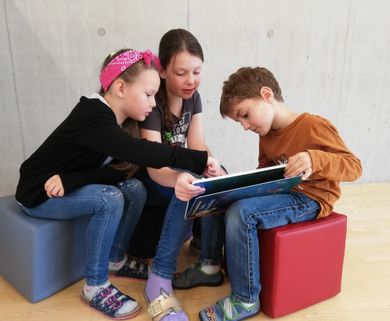 In der eigenen Bücherei des Schulzentrums können die Kinder in gemütlicher Atmosphäre in den Büchern schmökern und kostenlos Bücher für zuhause ausborgen.